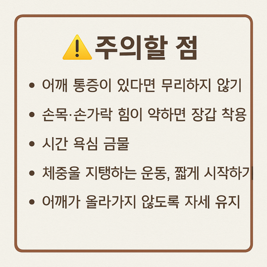 - 시간 욕심 금물 → 무리하게 오래 버티면 어깨 관절이나 손목에 무리가 갈 수 있습니다.